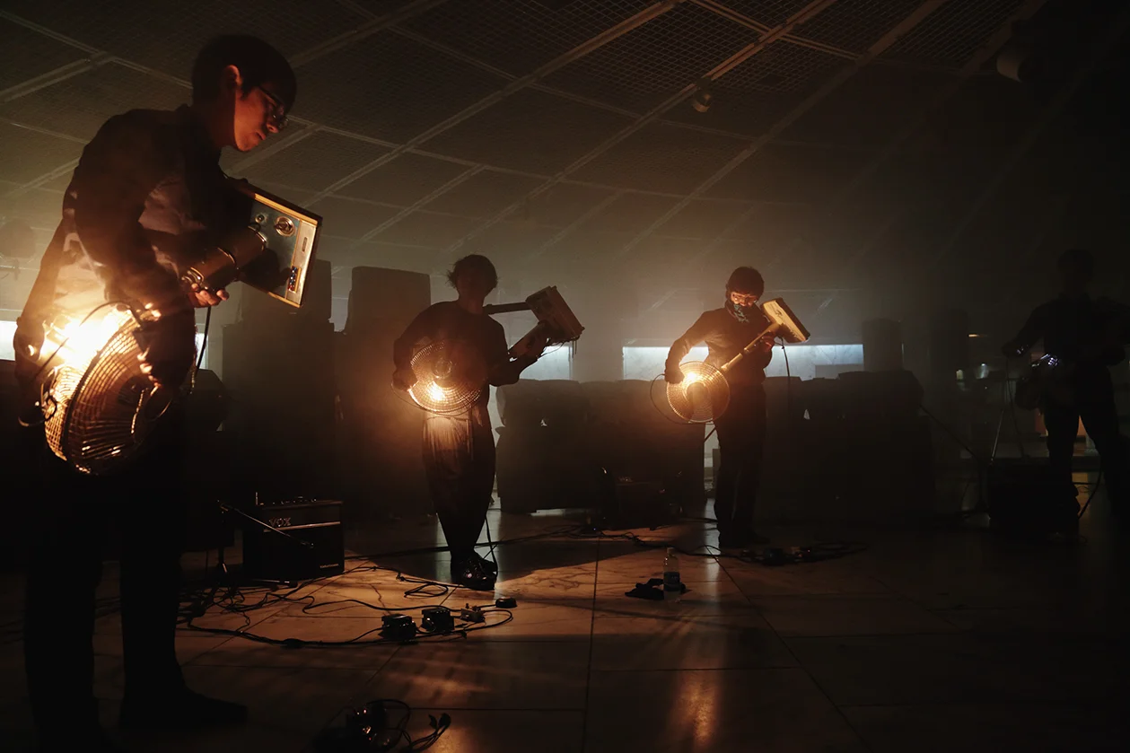 ギターストラップを取りつけて扇風機を担ぎ、調光器で電圧を変えてチョーキング。弱・中・強のスイッチは転調のスイッチへ。首を振るのは、もはや演奏者!